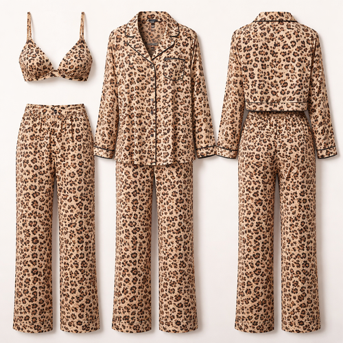 A brallete with only the straps on the shoulder also a pyjama pants and blouse in cheetah print. Kind of like a kind pyj...
