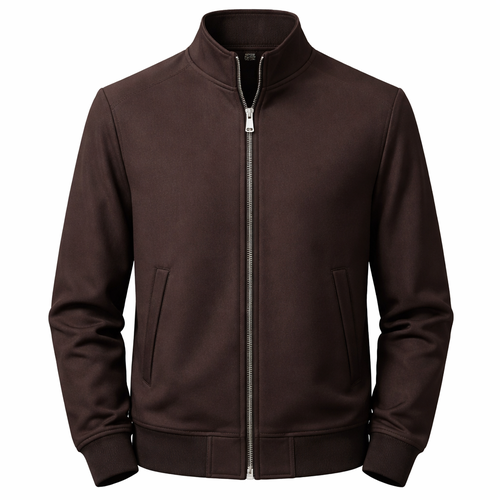 “Design a dark brown zip-up jacket made from soft, smooth fabric suitable for fall and winter. The jacket should feel pr...