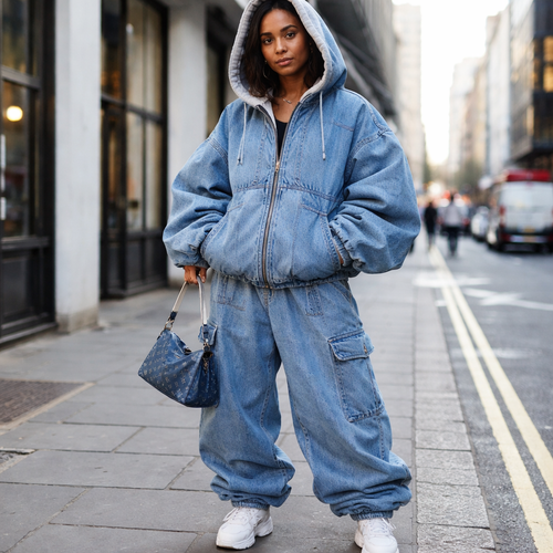 Design me a denim tracksuit with baggy denim pants and puffy denim hoodie