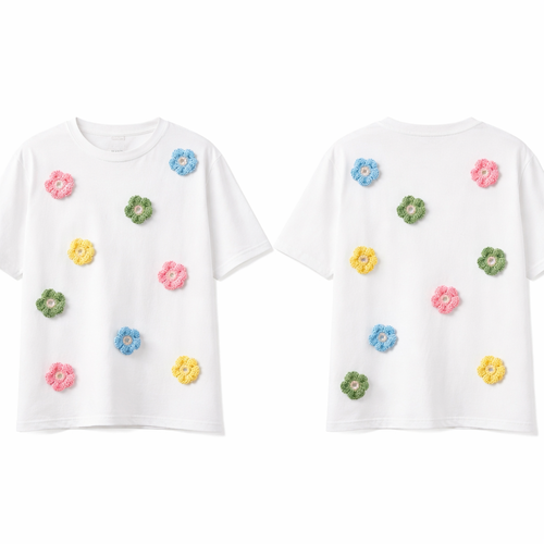 White T-shirt with colorful flowers (pink, blue, green, yellow) scattered, crocheted. On a white background as if photog...