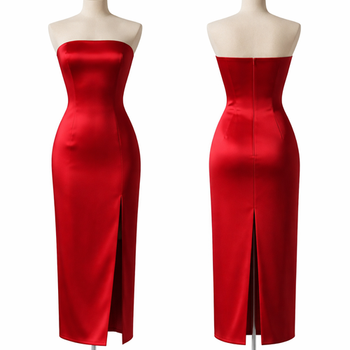 Create a picture of a strapless dress in red silk. It’s ankle length. Has darts. A zipper at the back and a slit at the ...