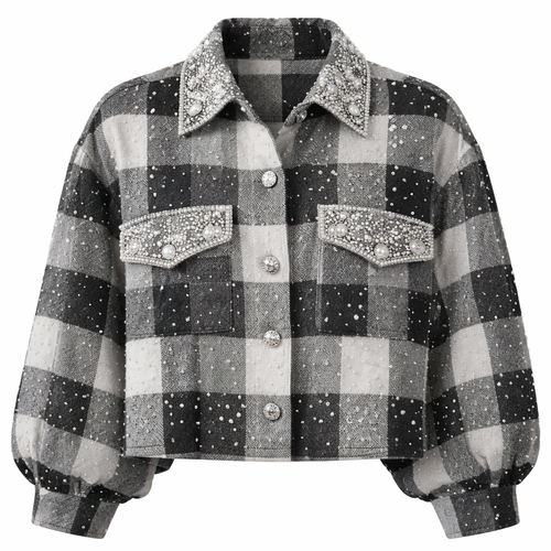 a boxy gray and white black checked shirt with small pearls and diamonds