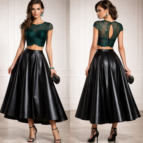 Create a gorgeous two piece evening look. The emerald green lace top should include cap sleeves, and interesting layers...