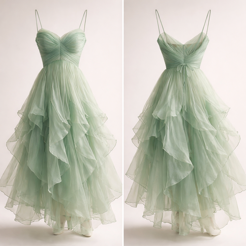 Dress, flowy, spaghetti straps, thin layers sheer that resemble cabbage leaves, sea foam green, midi