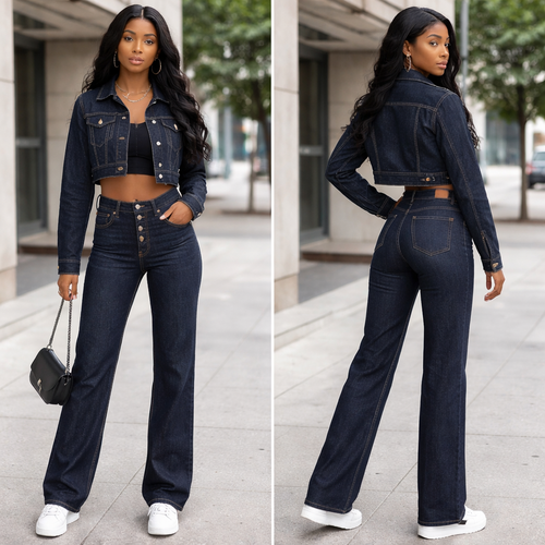 2 piece set. Denim jeans + denim jacket Dark denim Tall friendly Straight leg High waisted