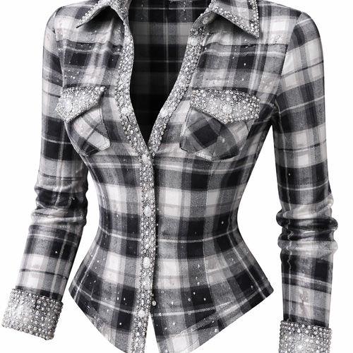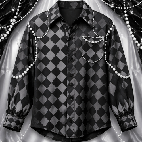 a checkered shirt with small pearls and diamonds, a nice cut, not baggy, more Y2K style, so it has a lot of swag, gray, ...