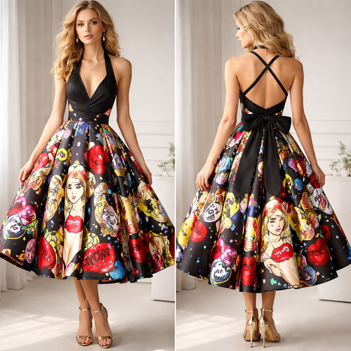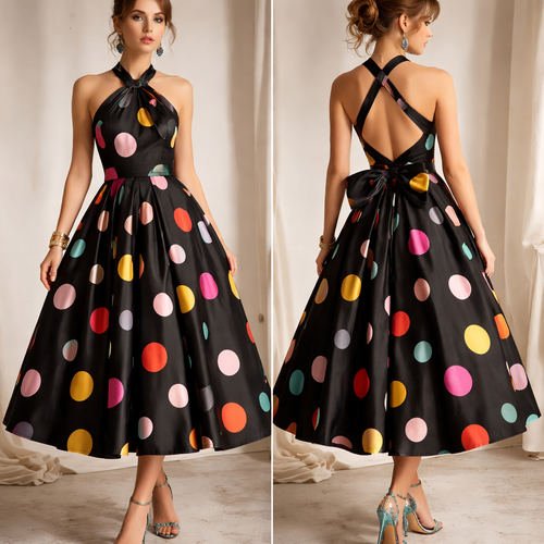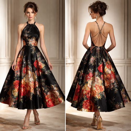 Create a gorgeous silk evening dress with a black halter neck, quirky back details and a full skirt, with a midi length ...