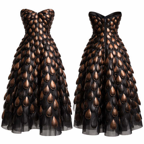 Dress, flowy, no straps, midi, fabric looks like layered watermelon seeds, black with a copper finish
