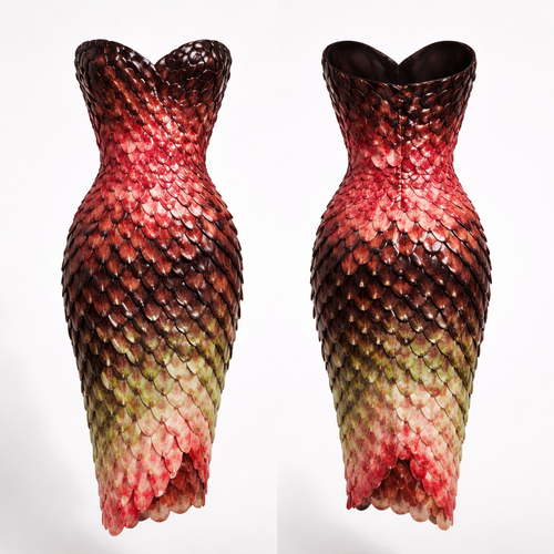 Dress, flowy, no straps, midi, form fitting, made of layered watermelon seeds