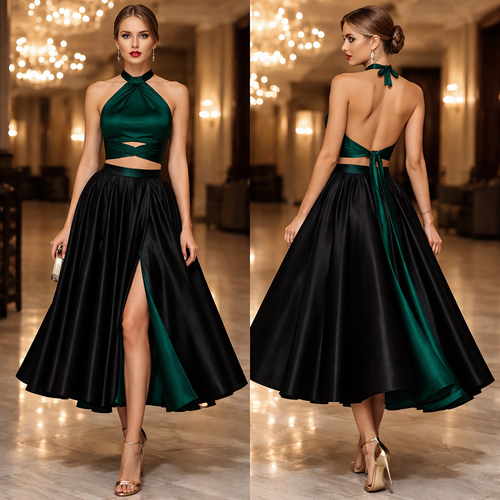 Create a stunning two piece outfit for a super elegant evening event. The emerald green silk halter neck top should incl...