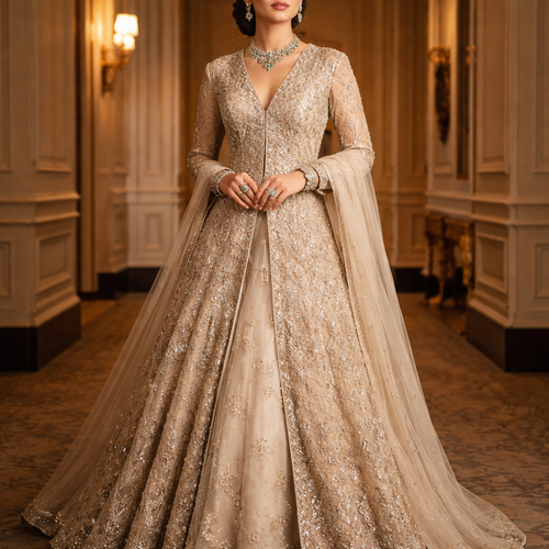 A Girl with a French Face and Brown hair in a bow she wears a floor length dress made of cotton with the upper part bein...