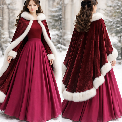 A Girl with a French Face and Brown hair in a bow she wears a floor length dress with the upper part being a Bordeaux re...