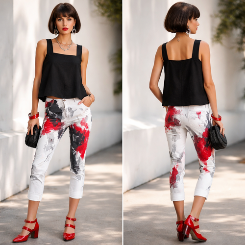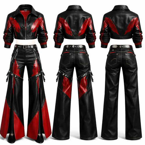 A black and red leather two piece The trouser will be a detachable flare that makes it a trouser The second detachab...
