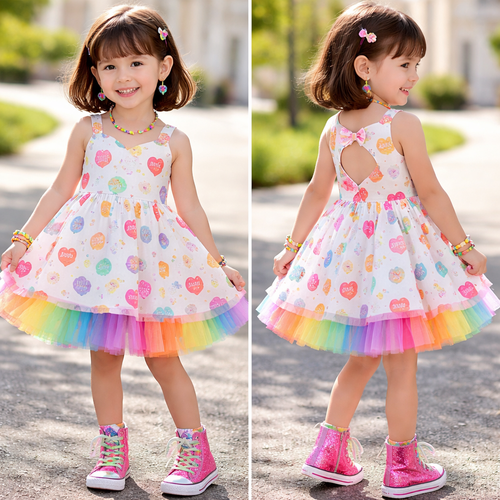 Create a gorgeous party dress for a 5 year old girl that includes a sweetheart neckline, a love heart candy print on a w...