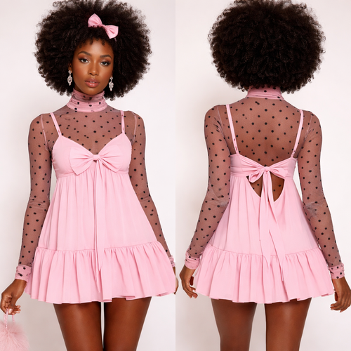 Pink babydoll dress worn with pink and black polka dot sheer turtle neck shirt