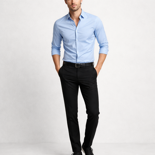Blue shirt with black pants and black casual shoe