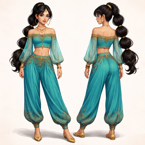 A 16 year old Girl with Middle Eastern Face has black hair in a bubble ponytail with golden hair ties wears turquoise to...