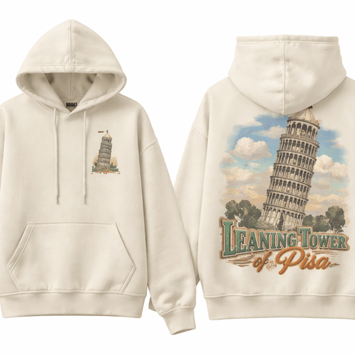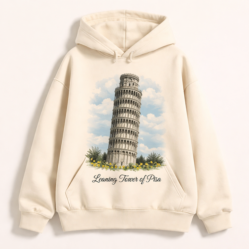 A hoddie with a print of the leaning tower of pisa on the front the main colour of the hoddie is cream