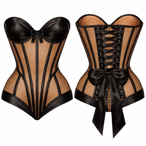 Caramel mesh corset with black silk cups, black silks boning case and a black ribbon about 2 inches of spacing at the ba...