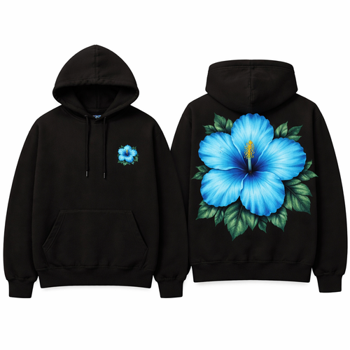 A black Hoodie with a blue hibiscus flower on the back and a small one on the right side on the front