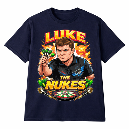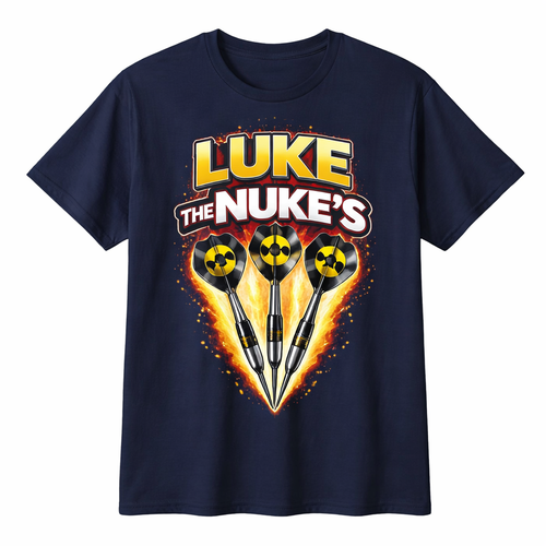 A navy blue top with just Luke the nukes darts printed on the front