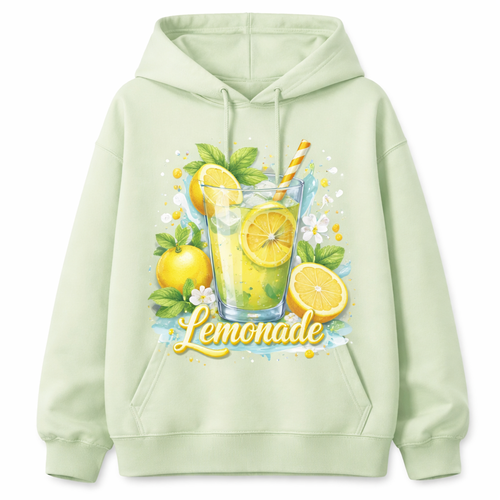 A light green hoodie with a glass of lemonaid