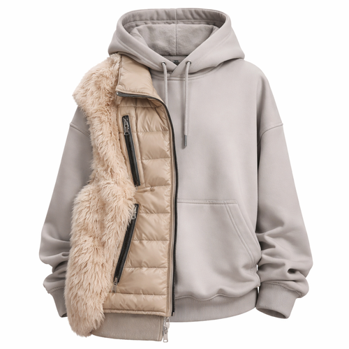 I want a sweatshirt with a hood, where a vest with fur on one side is sewn over the sweatshirt.
