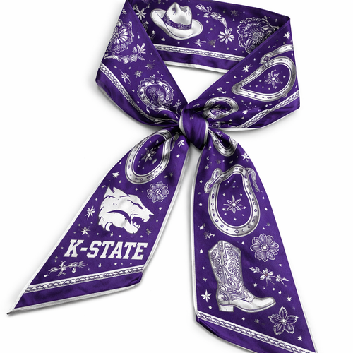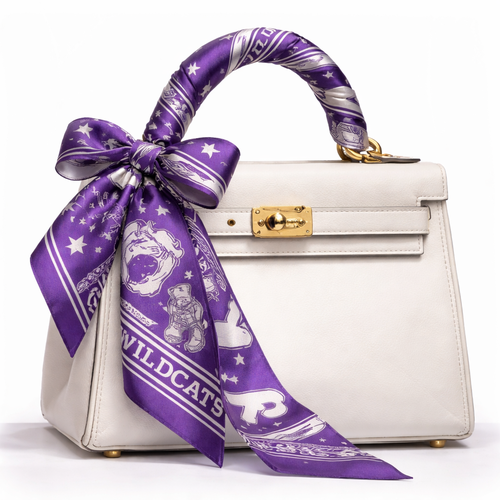 Create a silk scarf that fits the dimensions to wrap around the handle of a small Kelly bag in Kansas state university c...