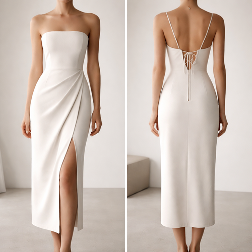 I want a design illustrated strictly as a one-piece fitted dress, not a wrapper or two-piece. It’s a floor-length Nige...