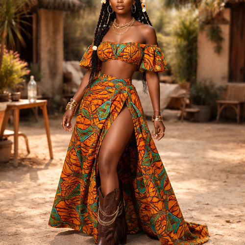 African pattern 2 pieces Off shoulder top with long skirt with long slit She is wearing leather cowboy boots on top t...