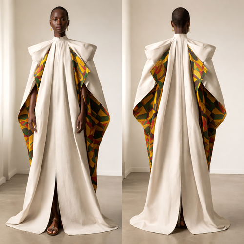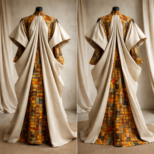 An avant-garde reinterpretation of the bubu. Floor-length with deep origami-style folds at the front and shoulders. Neck...