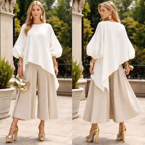 Tunic: Oversized with balloon sleeves or diagonal hemline • Culottes: Flowing, structured fabric that keeps the silhoue...