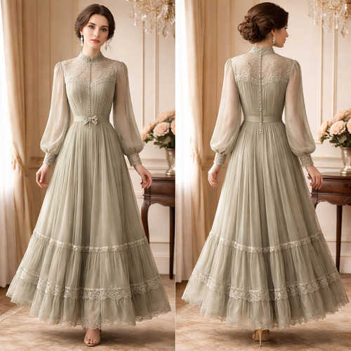 A structured midi-to-floor-length dress with a soft A-line silhouette. Features a modest V-neckline with an inner panel ...