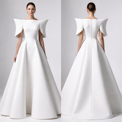 A floor-length sculptural gown with a structured trapeze silhouette. The bodice is firm and upright, extending into a dr...