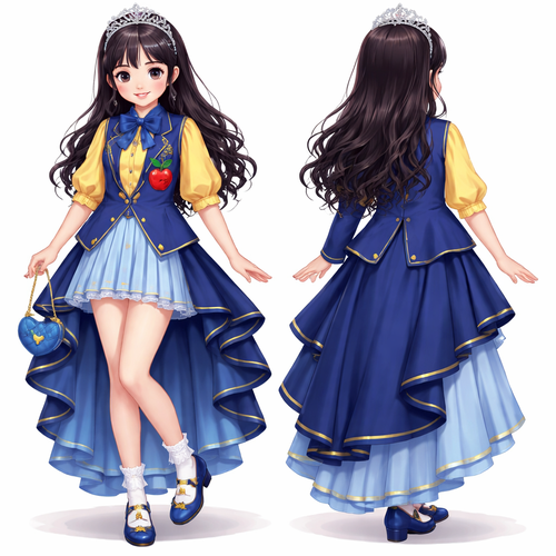 A 6th grade girl with black hair and a silver crown Rose cheeks yellow shirt with puffy sleeves a blue long skirt wi...