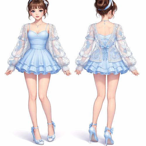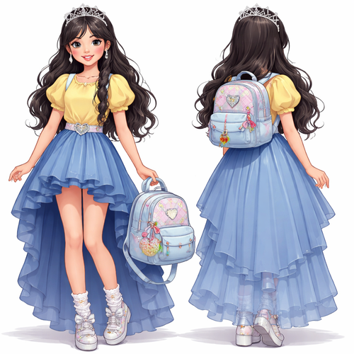 A Disney prince ciderella 12 year old girl with a school look a baby blue shirt with puffy sleeves and a baby blue ski...
