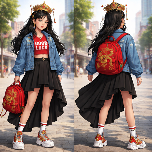 A Disney princess mulan 12 year old girl with a school look a Chinese a red crop top that says good luck in white lette...