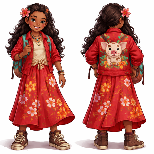 A Disney princess Moana 12 year old girl with a school look a island black girl with a beige shirt and a redlong skirt ...