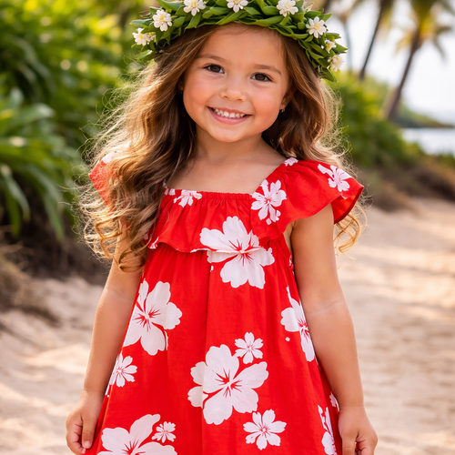 Haaiwain 5 year old girl in a red dress with white flowers and a hula headband