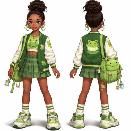 A Disney princess tinnan 12 year old black girl with a school look green crop top with frog on it green shirt and a b...