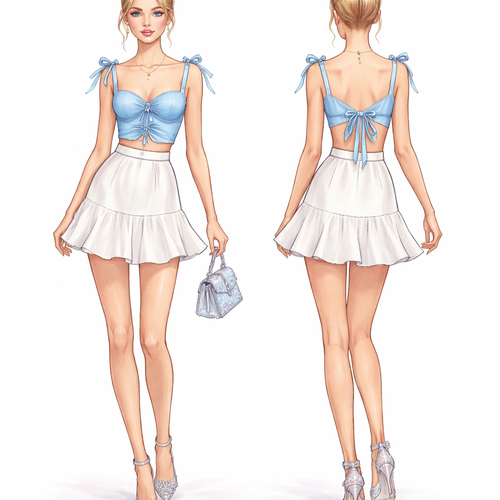 A 19 year old teenage girl with a European face and blond hair in a high bun wears light blue top and a white skirt and ...