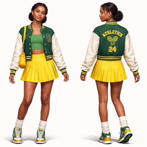 A 19 year old teenage girl with a African American face and black coiled hair in a low bun wears fern green top and a j...