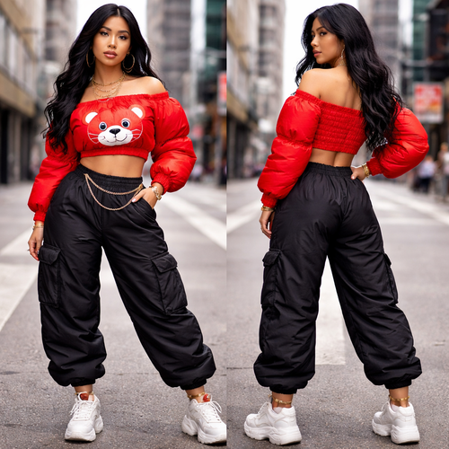Red puffy crop top with a red panda puffy black pants stomach chain gold bracelet on ankle