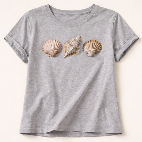 A gray top with three sea shells across the front