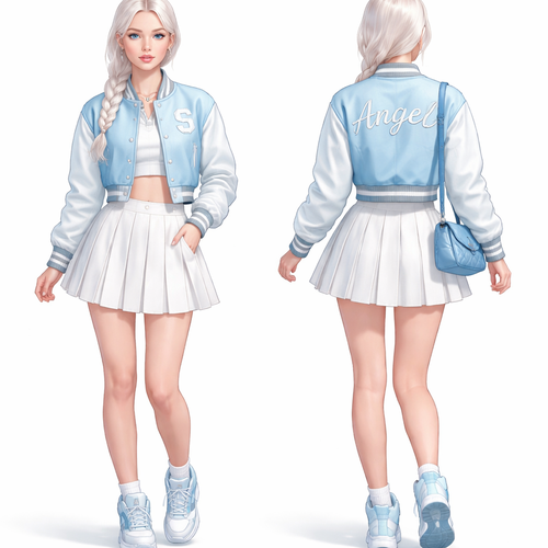 A 18 year old teenage girl with a Scandinavian face and white hair in one braid wears ice blue top with a white skirt an...