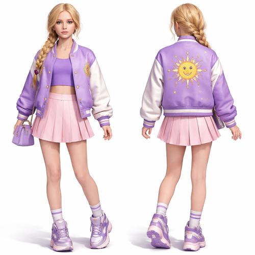 A 18 year old teenage girl with a European face and gold blond hair in one braid wears deep lilac top and a jacket with...