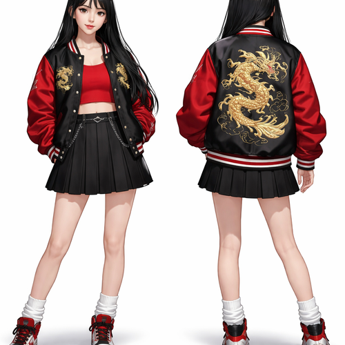 A 16 year old teenage girl with a Chinese face and black long hair wears red top and a jacket with a gold dragon and bl...
