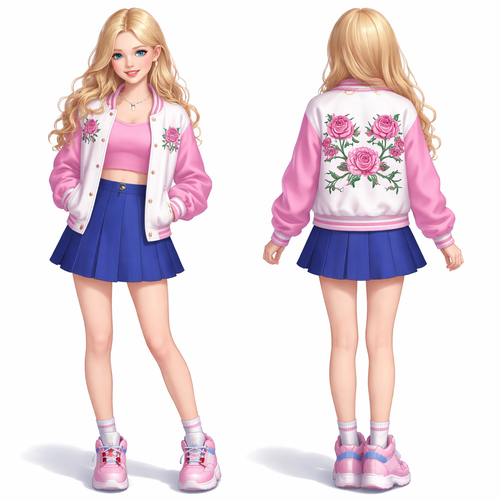 A 19 year old teenage girl with a European face and blond hair in a high bun wears light blue top and a white skirt and ...