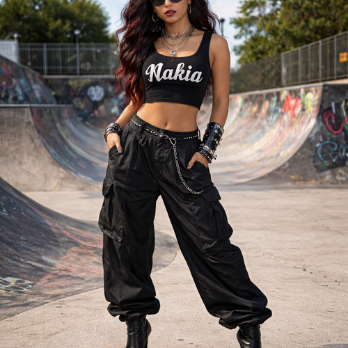 Black crop tops that says Nakia in white letters and puffy black pants black heals dark red lipstick black glasses ...
