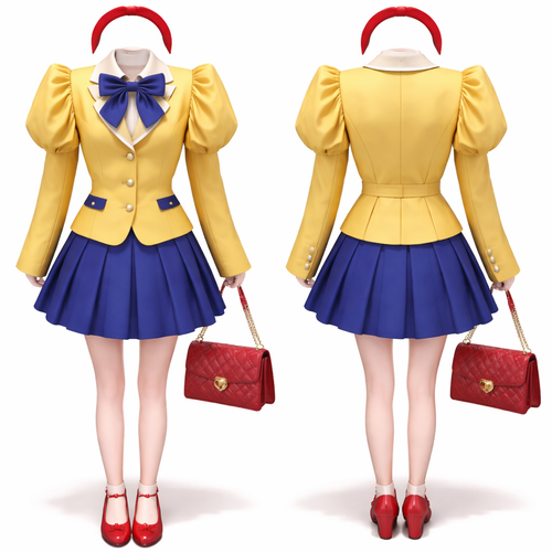 A girl with ebony black hair and fair skin and red lips has a yellow Blazer with puff sleeves and a royal blue skirt wit...